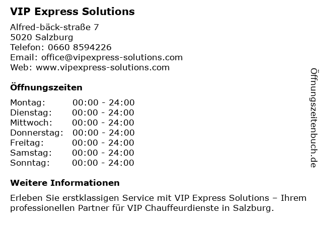 | Öffnungszeiten VIP Express Solutions in Salzburg anzeigen | |