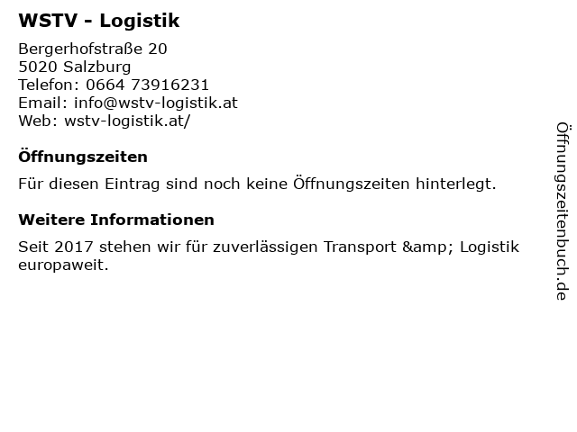 | Öffnungszeiten WSTV - Logistik in Salzburg anzeigen | |