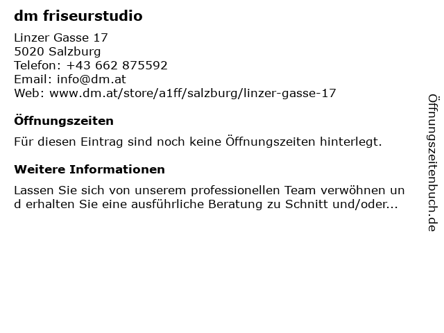 | Öffnungszeiten dm friseurstudio in Salzburg anzeigen | |