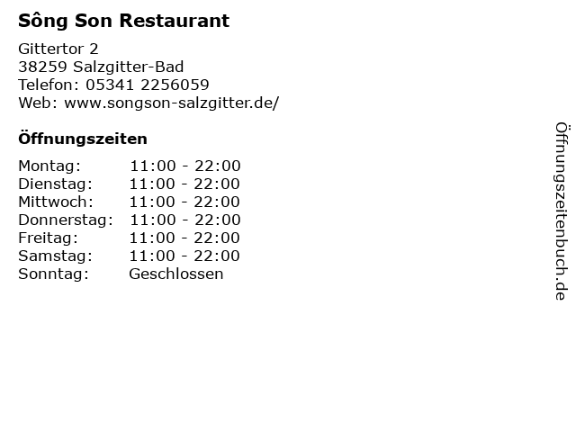 | Öffnungszeiten Sông Son Restaurant in Salzgitter-Bad anzeigen | |