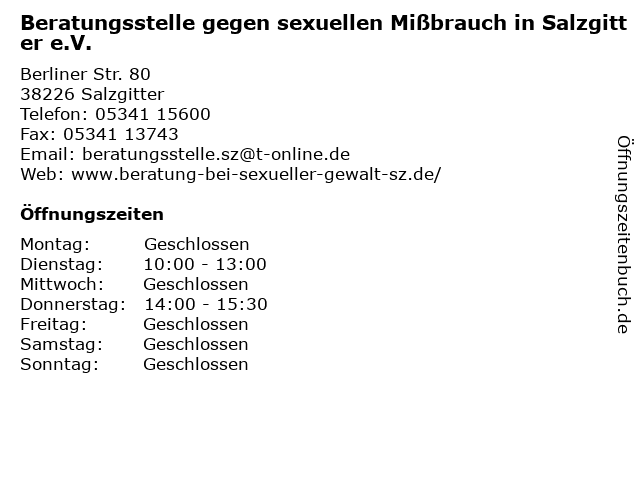 Branchen & Suchbegriffe zu Beratungsstelle gegen sexuellen Mißbrauch in Salzgitter e.V.:beratungsstelle, beratungsstellen, e.v., gegen, mißbrauch, psychologische, sexuellen |