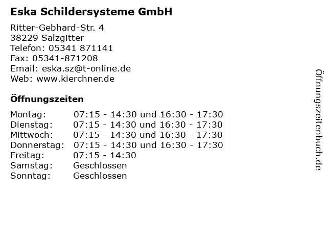 | Öffnungszeiten Eska Schildersysteme GmbH in Salzgitter anzeigen | |