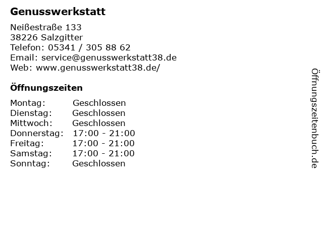 | Öffnungszeiten Genusswerkstatt in Salzgitter anzeigen | |