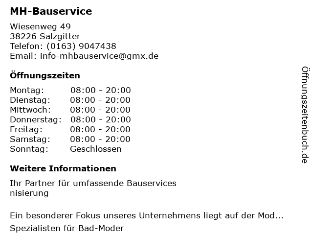 | Öffnungszeiten MH-Bauservice in Salzgitter anzeigen | |