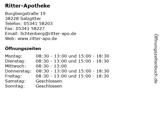| Öffnungszeiten Ritter-Apotheke in Salzgitter anzeigen | |