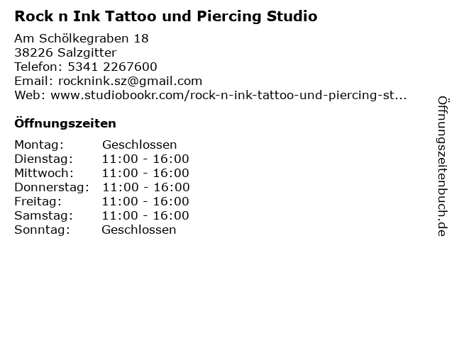 3 Steelfull Ink Tattoo Dietlind Jakob Tattoostudio (Entfernung: 1,12 km) Chemnitzer Str. 64, 38226 Salzgitter 5 Sacred Seven Tattoo- & Piercing Studio (Entfernung: 13,72 km) Großer Zimmerhof 23, 38300 Wolfenbüttel 6 INK Therapy Tattoo Studio Wolfenbüttel (Entfernung: 14,12 km) Lange Herzogstraße 42, 38300 Wolfenbüttel |