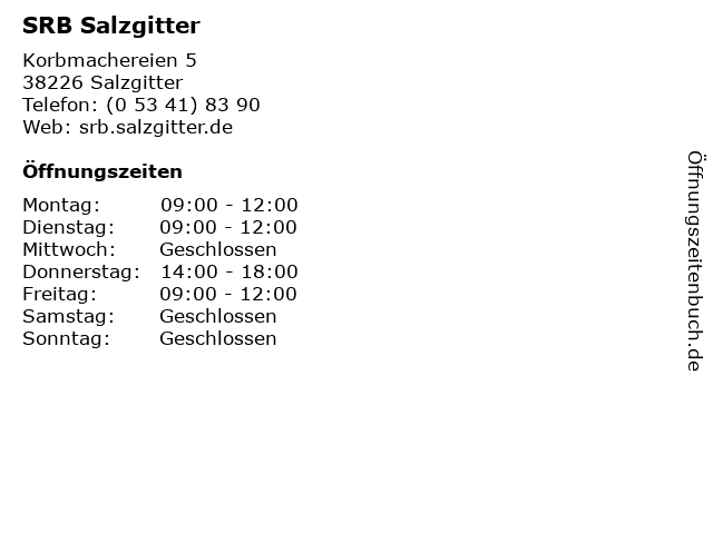 | Öffnungszeiten SRB Salzgitter in Salzgitter anzeigen | |
