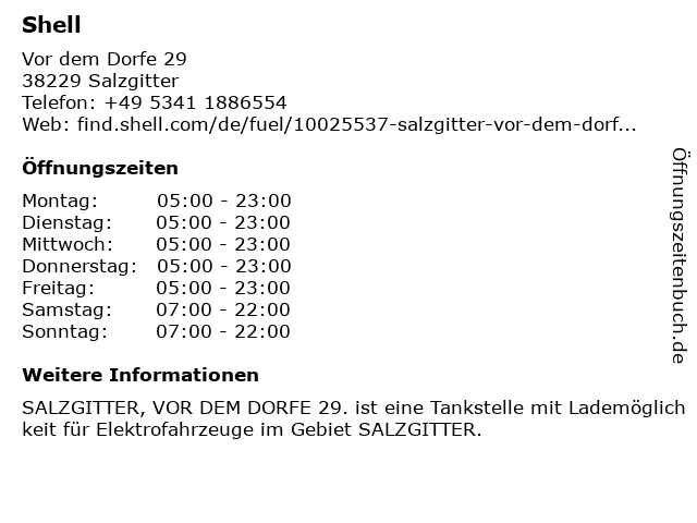 | Öffnungszeiten Shell in Salzgitter anzeigen | |