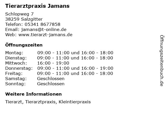 | Öffnungszeiten Tierarztpraxis Jamans in Salzgitter anzeigen | |