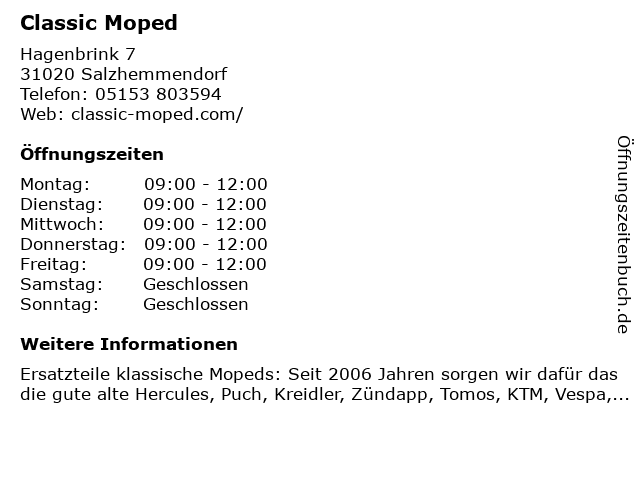 | Öffnungszeiten Classic Moped in Salzhemmendorf anzeigen | |