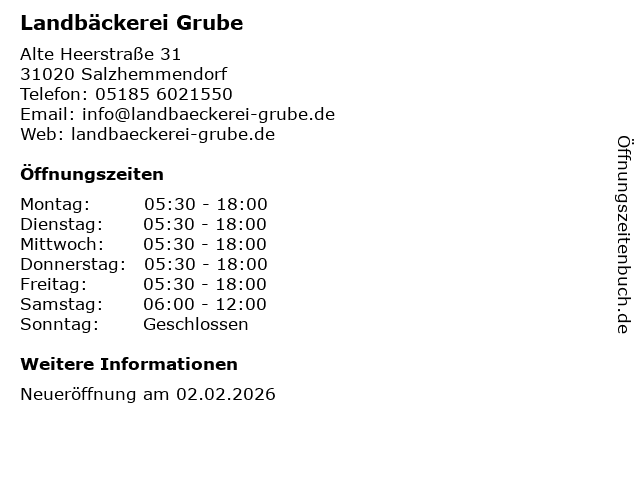 | Öffnungszeiten Landbäckerei Grube in Salzhemmendorf anzeigen | |