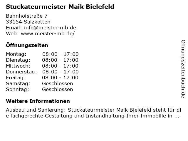 | Öffnungszeiten Stuckateurmeister Maik Bielefeld in Salzkotten anzeigen | |