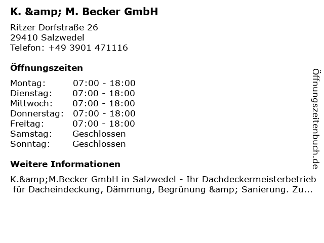 | Öffnungszeiten K. & M. Becker GmbH in Salzwedel anzeigen | |