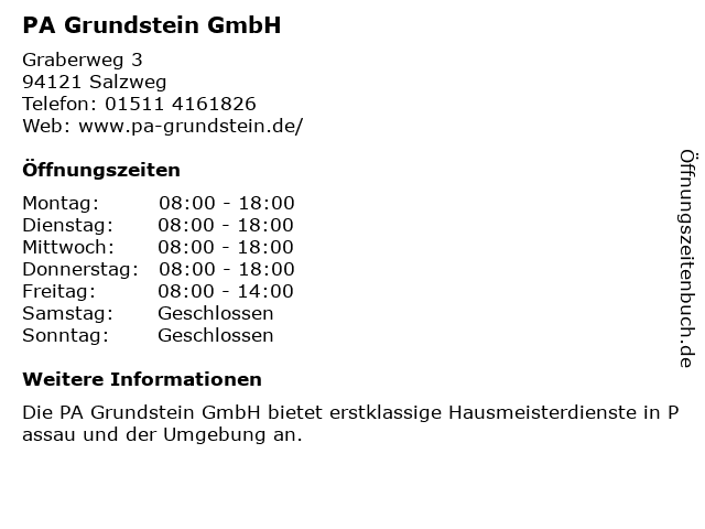 | Öffnungszeiten PA Grundstein GmbH in Salzweg anzeigen | |