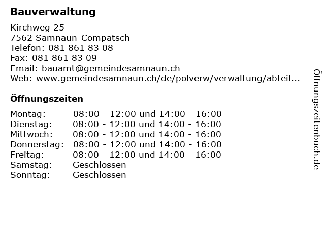 | Öffnungszeiten Bauverwaltung in Samnaun-Compatsch anzeigen | |