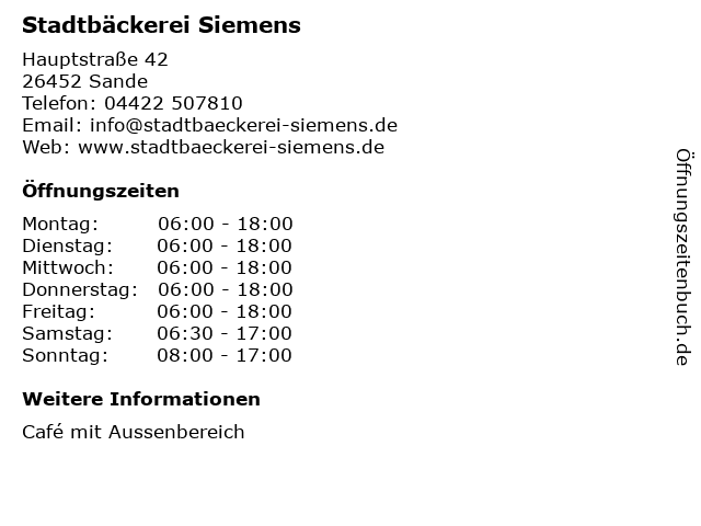 | Öffnungszeiten Stadtbäckerei Siemens in Sande anzeigen | |