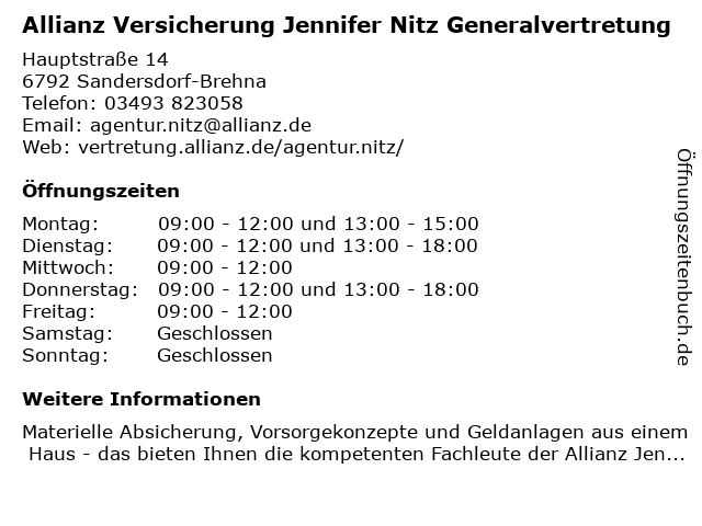 2 Allianz Generalvertretung Renzo Wernicke (Entfernung: 0,44 km) Zörbiger Str. 11, 06792 Sandersdorf-Brehna 5 Mecklenburgische Versicherungsgruppe - Bezirks-Generalvertretung Jürgen Schünemann (Entfernung: 9,41 km) Markesche Str. 15, 06779 Raguhn-Jeßnitz 6 Mecklenburgische Versicherungsgruppe - Generalvertretung Maik Fischer (Entfernung: 12,70 km) Bismarckstraße 9, 04509 Delitzsch |