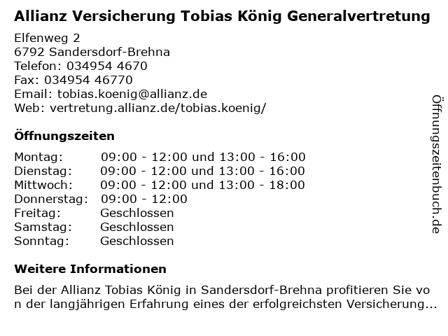 1 Allianz Generalvertretung Renzo Wernicke (Entfernung: 0,57 km) Zörbiger Str. 11, 06792 Sandersdorf-Brehna 5 Autohaus König & Partner GmbH & Co. KG - Teiledienst (Entfernung: 8,21 km) Thura Mark 1, 06780 Zörbig 6 Autohaus König & Partner GmbH & Co. KG - Werkstatt u. Service (Entfernung: 8,21 km) Thura Mark 1, 06780 Zörbig |