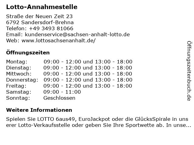 4 Lotto-Annahmestelle (Entfernung: 3,98 km) Walter-Rathenau-Straße 52, 06749 Bitterfeld-Wolfen OT Bitterfel 6 |