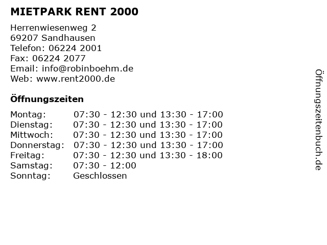 | Öffnungszeiten MIETPARK RENT 2000 in Sandhausen anzeigen | |