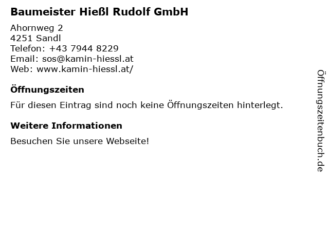 | Öffnungszeiten Baumeister Hießl Rudolf GmbH in Sandl anzeigen | |