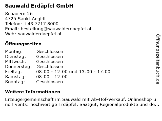 | Öffnungszeiten Sauwald Erdäpfel GmbH in Sankt Aegidi anzeigen | |