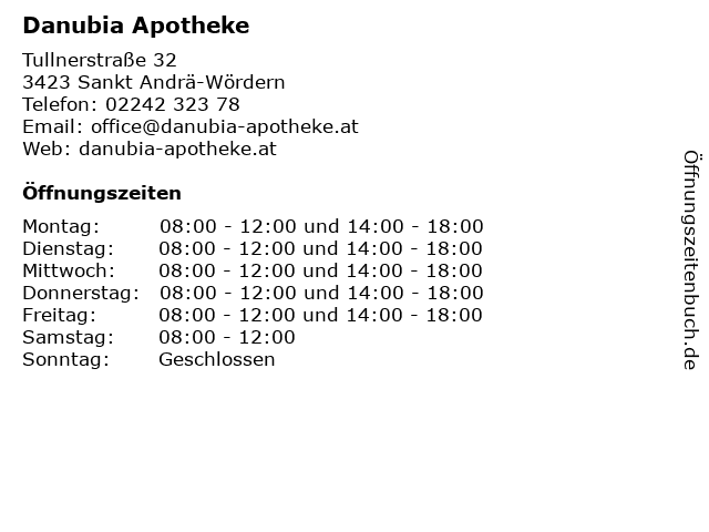 | Öffnungszeiten Danubia Apotheke in Sankt Andrä-Wördern anzeigen | |
