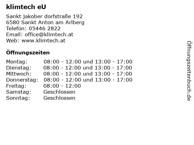 | Öffnungszeiten klimtech eU in Sankt Anton am Arlberg anzeigen | |