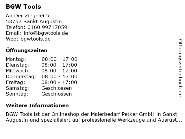 | Öffnungszeiten BGW Tools in Sankt Augustin anzeigen | |