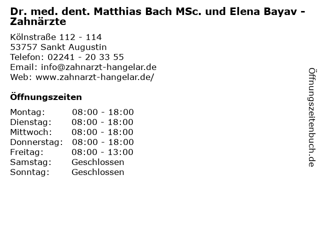 2 Praxis für ZahnMedizin am Lindenhof Dr. med. dent. Christiane K. E. Feinen, MSc. (Entfernung: 3,28 km) Bonner Str. 81 a, 53757 Sankt Augustin 4 Dr. med. dent. Sven-Erik Rosenhayn, Zahnarzt (Entfernung: 3,53 km) Siegstraße 22, 53757 Sankt Augustin 6 |