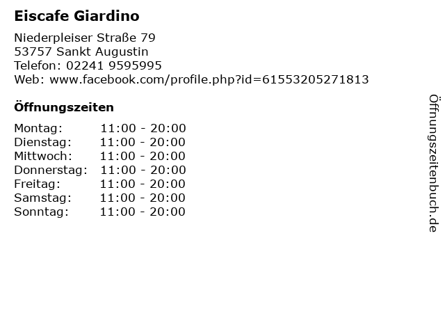 | Öffnungszeiten Eiscafe Giardino in Sankt Augustin anzeigen | |