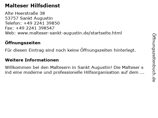 | Öffnungszeiten Malteser Hilfsdienst in Sankt Augustin anzeigen | |