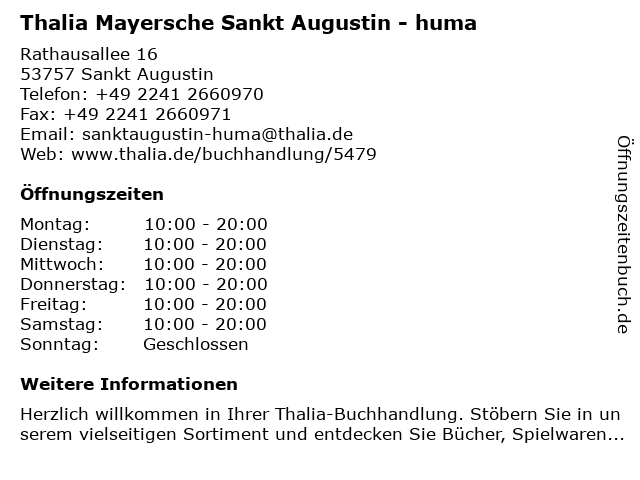 Branchen & Suchbegriffe zu Thalia Mayersche Sankt Augustin - huma:augustin, bestseller, bookshop, buchhandlung sankt augustin, buchladen, bücher, ebooks, huma, mayersche, sankt, spielwaren, thalia, thalia buchhandlung, thalia sankt augustin |