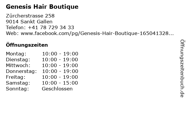 | Öffnungszeiten Genesis Hair Boutique in Sankt Gallen anzeigen | |