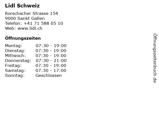 | Öffnungszeiten Lidl Schweiz in Sankt Gallen anzeigen | |