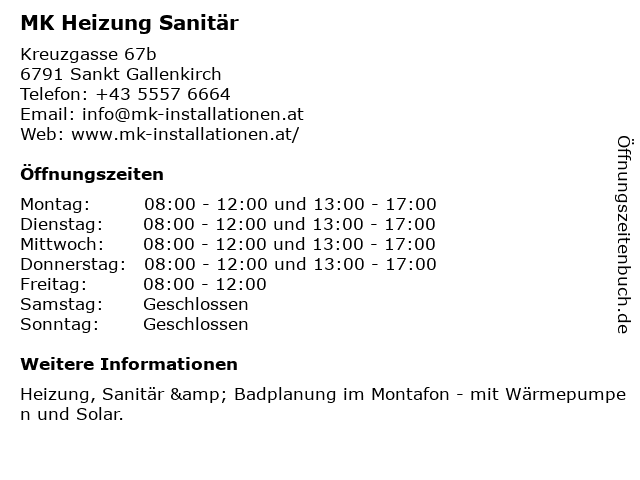 | Öffnungszeiten MK Heizung Sanitär in Sankt Gallenkirch anzeigen | |