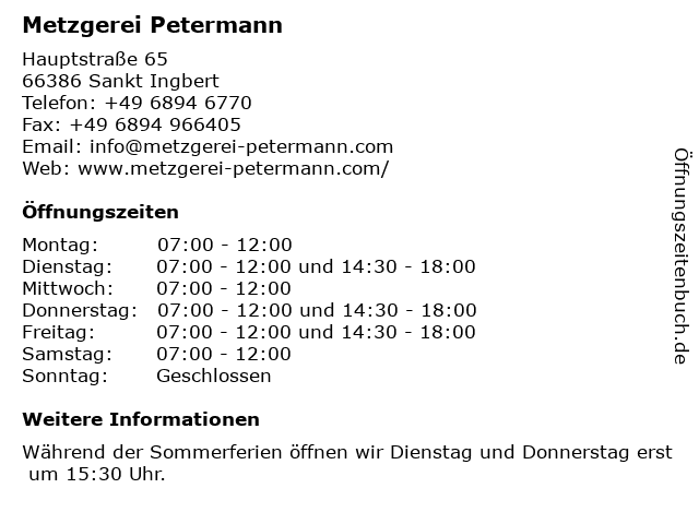 | Öffnungszeiten Metzgerei Petermann in Sankt Ingbert anzeigen | |