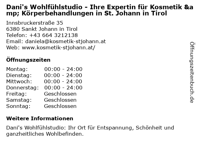 1 VorDenker Social Media Agentur - Ihre beste Social Media Agentur in Tirol für Ihren Erfolg (Entfernung: 7,29 km) Kitzbüheler Straße 14, 6370 Reith bei Kitzbühel 2 Kosmetik & Fußpflege Carina Gruber (Entfernung: 0,49 km) Pass-Thurn-Straße 17, 6380 St. Johann in Tirol 3 Mediküre - Die beste Maniküre, Fusspflege, Gesichtspflege, Haarentfernung und Massage in St. Johann in Tirol (Entfernung: 1,20 km) Speckbacherstraße 5, 6380 St. Johann in Tirol 5 Faceart - Permanent Makeup & Microblading - Kitzbühel (Entfernung: 9,36 km) Jochberger Straße 62, 6370 Kitzbühel 6 |
