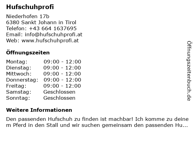 | Öffnungszeiten Hufschuhprofi in Sankt Johann in Tirol anzeigen | |
