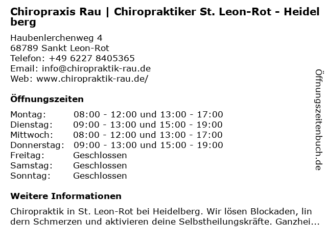 2 Chiropraxis Rau | Chiropraktiker Nussloch - Heidelberg (Entfernung: 8,15 km) Hauptstraße 95, 69226 Nußloch 6 |