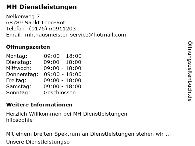 | Öffnungszeiten MH Dienstleistungen in Sankt Leon-Rot anzeigen | |