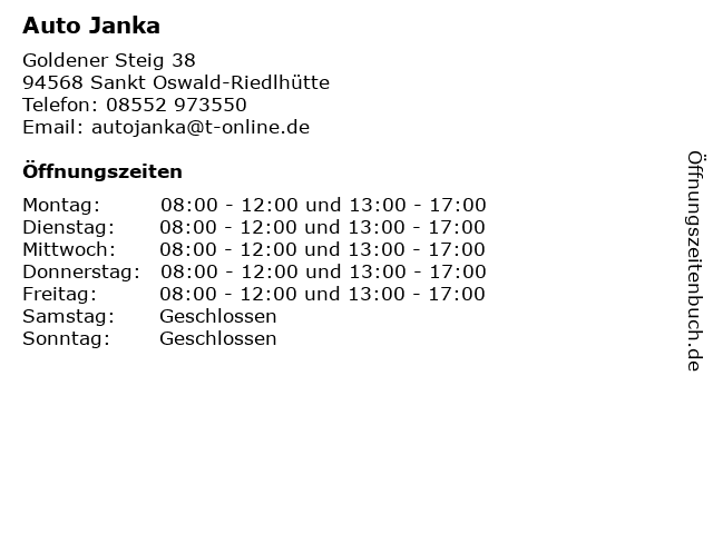 | Öffnungszeiten Auto Janka in Sankt Oswald-Riedlhütte anzeigen | |