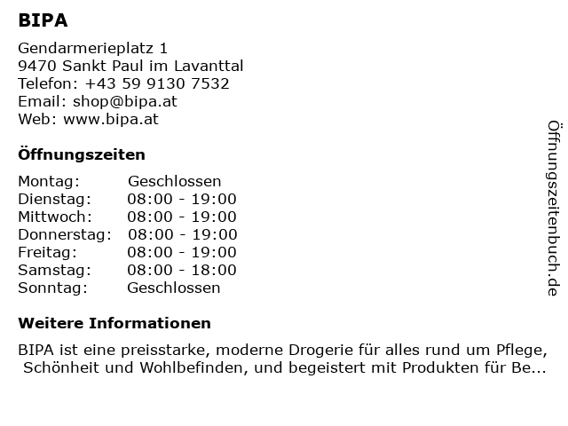 | Öffnungszeiten BIPA in Sankt Paul im Lavanttal anzeigen | |