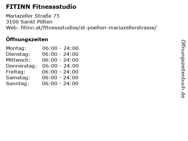 | Öffnungszeiten FITINN Fitnessstudio in Sankt Pölten anzeigen | |
