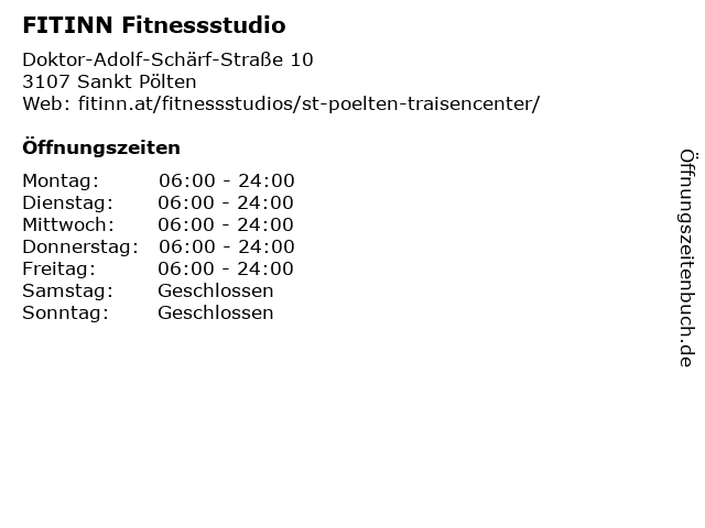 | Öffnungszeiten FITINN Fitnessstudio in Sankt Pölten anzeigen | |