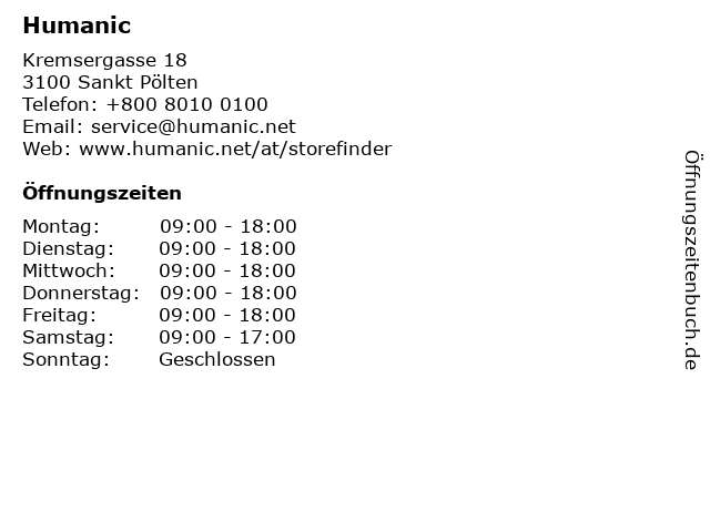 | Öffnungszeiten Humanic in Sankt Pölten anzeigen | |