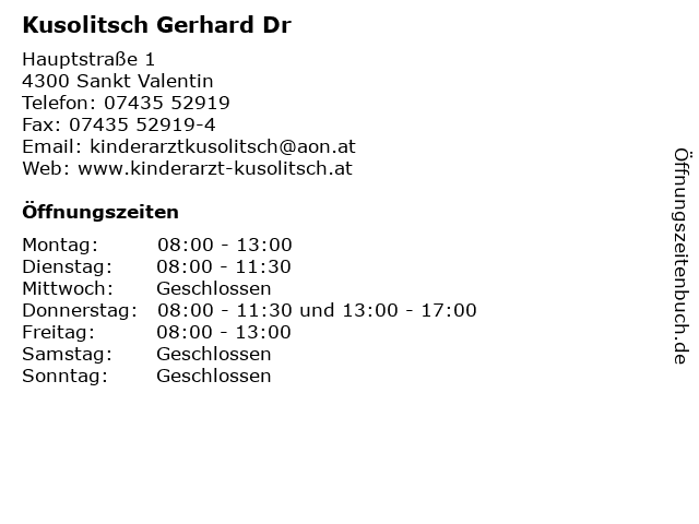 | Öffnungszeiten Kusolitsch Gerhard Dr in Sankt Valentin anzeigen | |