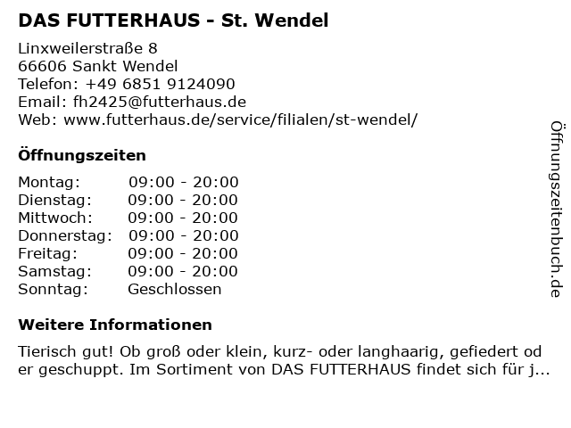 5 Garten- und Zoobedarf Helmut David GmbH (Entfernung: 12,39 km) Wellesweilerstr. 10, 66538 Neunkirchen 6 Scheidhauer's Hundeglück - Der Hundefutterladen (Entfernung: 19,82 km) Obere Kaiserstraße 92, 66386 Sankt Ingbert |