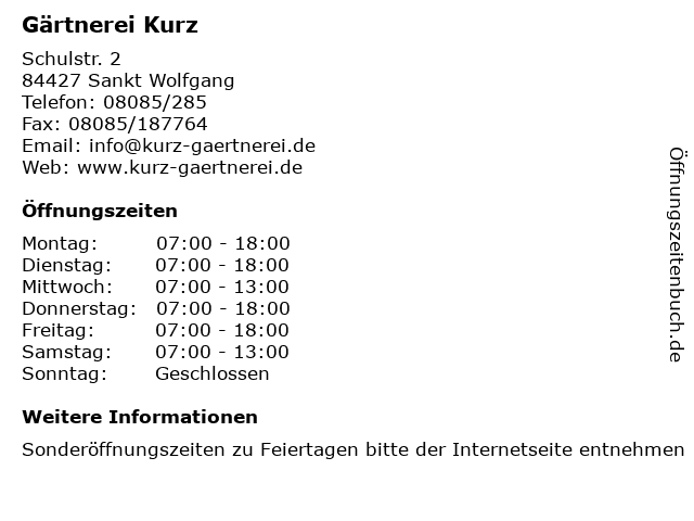 | Öffnungszeiten Gärtnerei Kurz in Sankt Wolfgang anzeigen | |