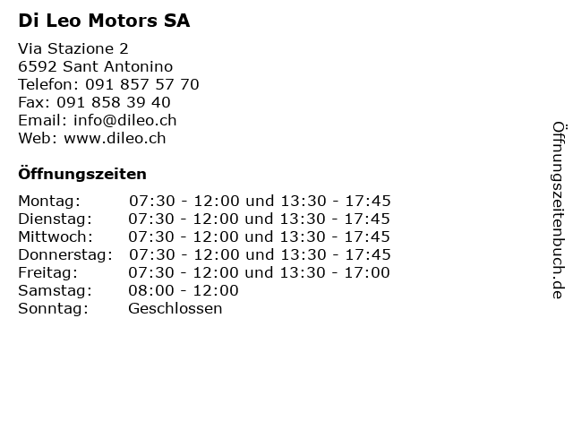 | Öffnungszeiten Di Leo Motors SA in Sant Antonino anzeigen | |